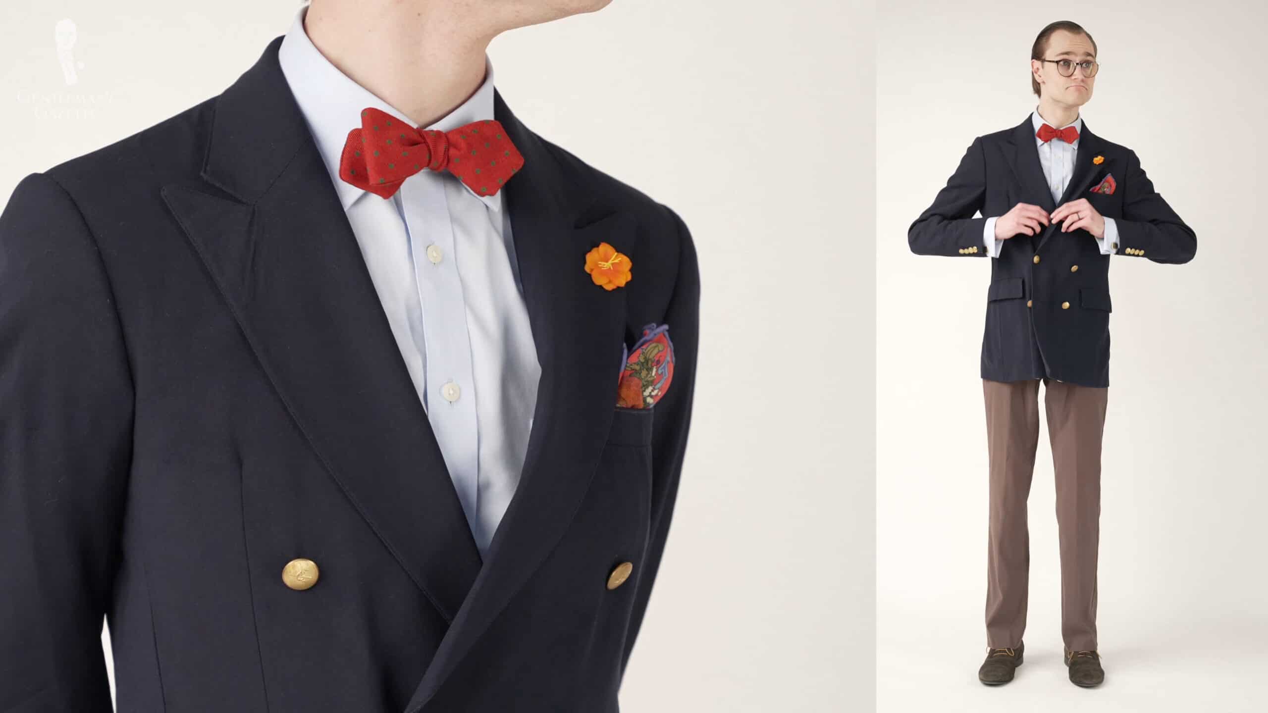 So, along with the bow tie, I’m wearing a plain blue French-cuffed shirt and a navy blue blazer with gold buttons. Into the cuffs of the shirt, I’ve got some simple gold vintage cufflinks inserted that harmonize well with the blazers buttons.
