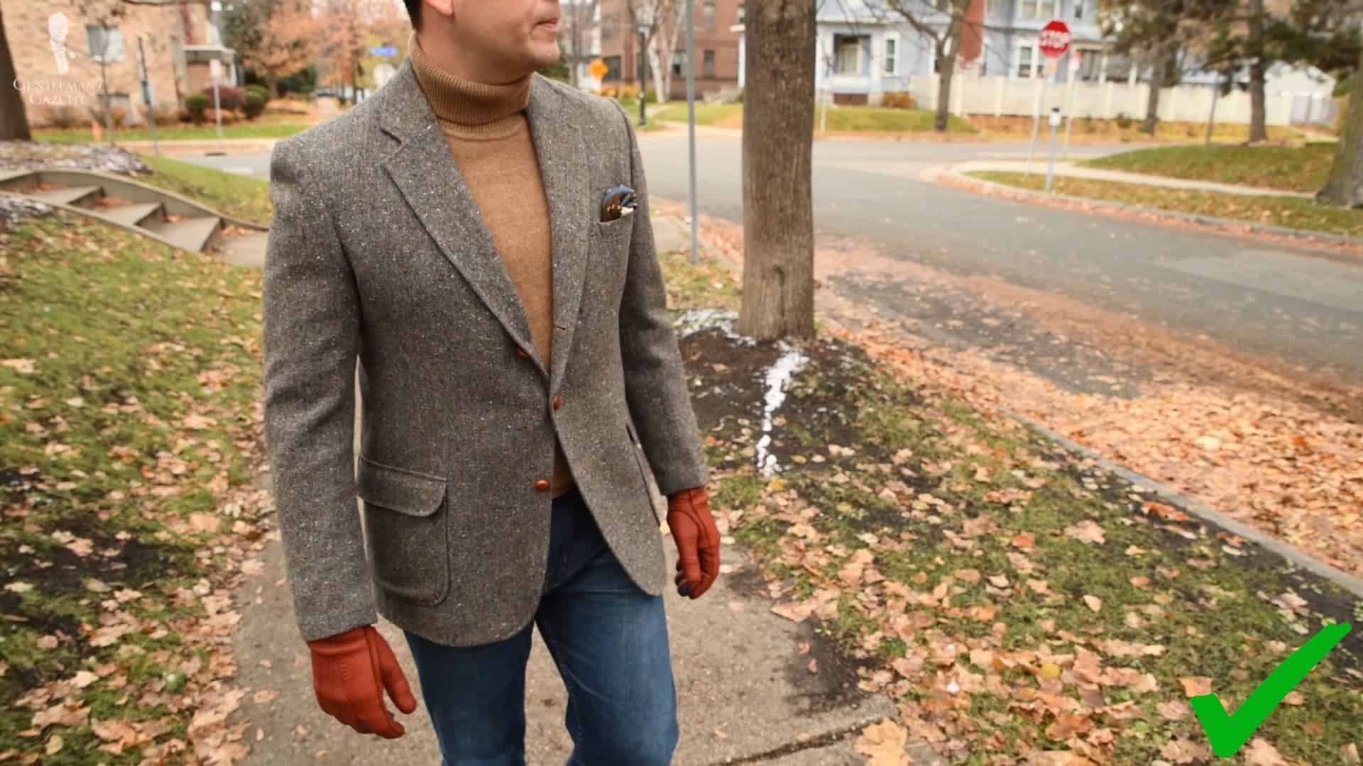 This outfit is also fairly simple to pull off but is best suited for a colder season. If you currently don’t own any turtlenecks, I would recommend that you start looking for some in neutral colors in either merino wool or a cashmere blend. Try to find some that are also not too bulky because it’s important to maintain some sense of freedom of movement underneath your sport coat.
