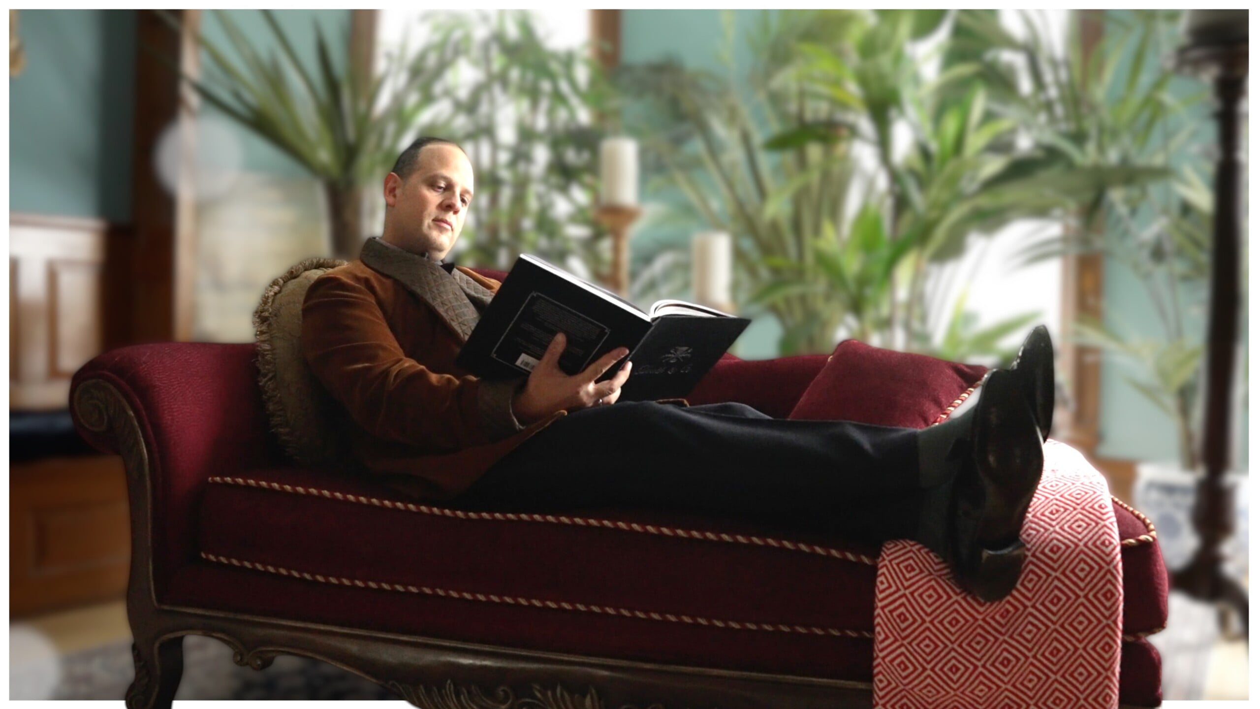 Man in a plaid robe and tie sitting in an ornate armchair, holding a glass of water and reading a blue hardcover book, with playing cards on a side table in the foreground.
