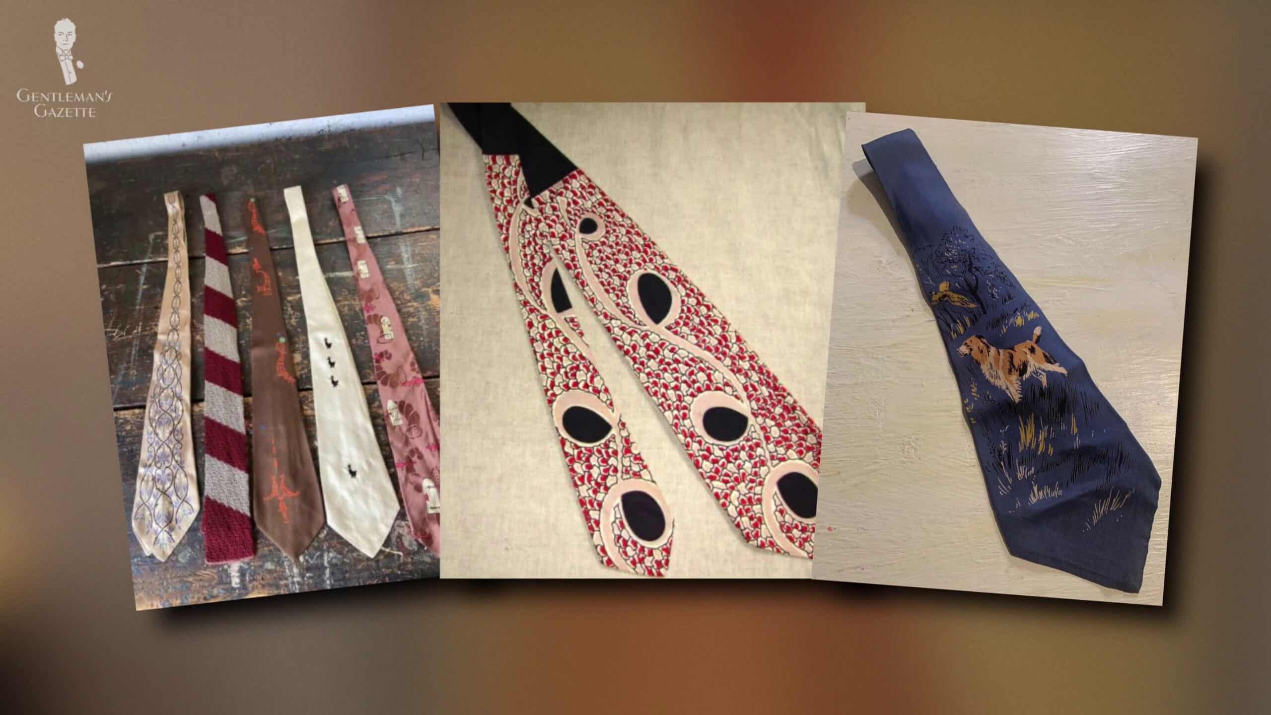 Custom handpainted ties with your hobbies, such as fish or maybe an attractive woman or other things in your life became popular, and even though they’ve been around since the ’20s, the ’40s was really the time when those kinds of ties took off.