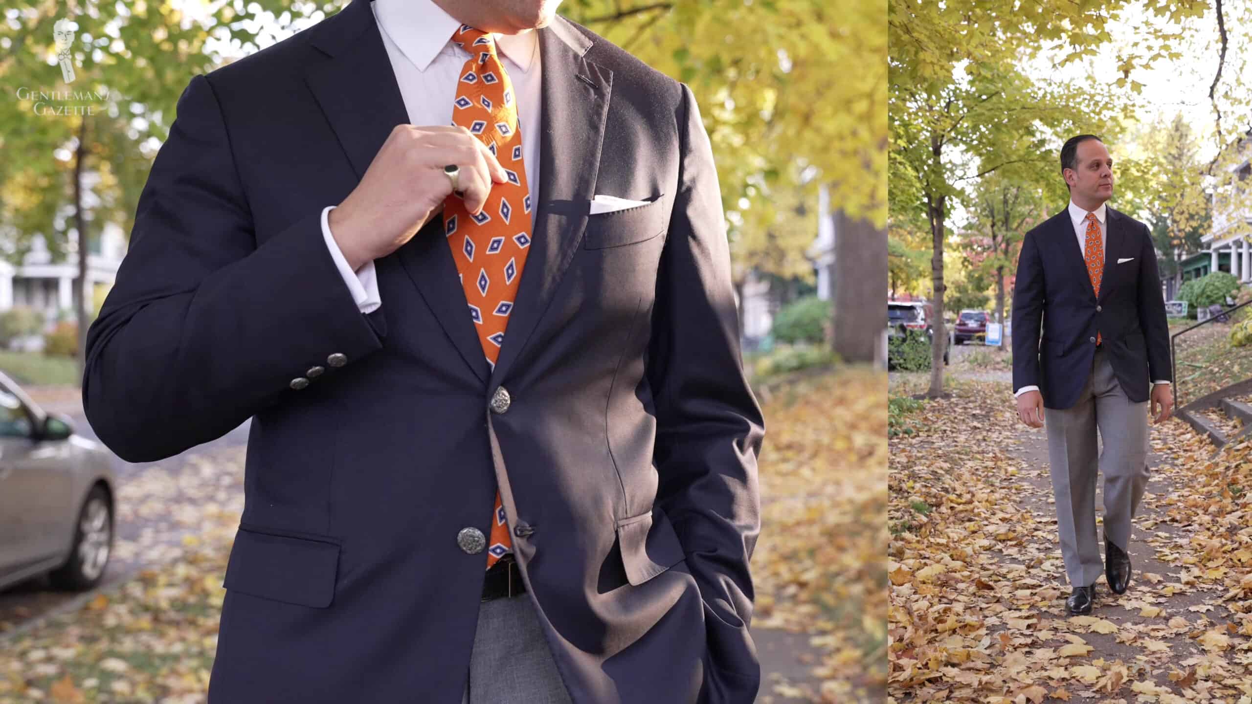 My pocket square is a plain white pocket square that is linen. It’s from Fort Belvedere and you can find it in our shop, just like my orange and blue socks. And no, that’s not something men would have worn in the 1940s, but with this tie, I thought it would go well together. My shoes are black Oxfords that are semi-brogues and they’re very uneventful. I paired them with a black belt from Fort Belvedere and a gold buckle so it matches my little pinky ring as well as my cufflinks. Yes, I know men didn’t wear cufflinks because the single-barrel cuff would also do, but hey, I love cufflinks.